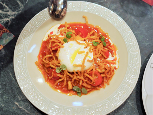 慢慢弄的Burrata起司、羅馬番茄、酥炸豬油渣、虱目魚香絲、香料紅油、小羅勒……。這道做為涼菜前菜很適合,開胃!