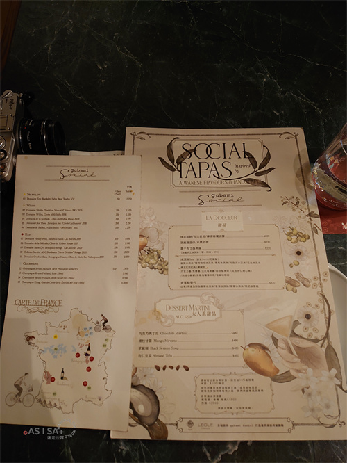 食物、甜點、調酒都有各自食材元素的插畫,酒單menu還畫了個可愛的法國產區地圖,用心設計的菜單看起來就是愉悅~ 餐廳整體給人的感覺,在精緻優雅中帶著輕鬆寫意,從環境、餐具、菜單、服務…都可感受到主廚成功營造了放鬆社交享受美食的氛圍。