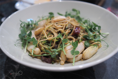 義大利細麵、沙茶蟹肉、酸豆、櫛瓜、阿發師肉燥;