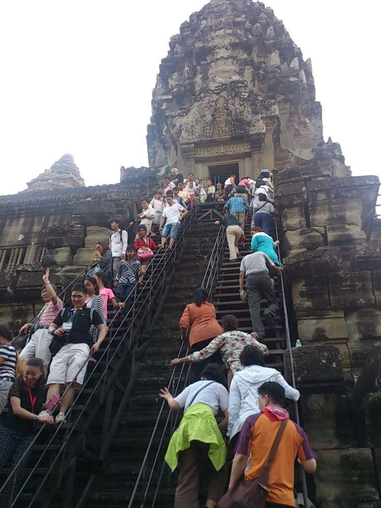 15世紀因暹羅阿育陀耶王朝(今泰國大城Ayuttaya)的侵犯與佔領,導致吳哥王朝的遷移、終至滅亡,逐漸凋零荒廢的吳哥城與神殿就此被森林所覆蓋。吳哥城的修復之路也挺坎坷的,1908年由法國遠東學院開始進行數十年的的漫長修復之路,中間又因政局動盪而停頓,直到1990年才又開始修復工作,參觀時其實可以看到吳哥遺跡許多部份仍在維修中。我恰巧是在2013年年初與年末兩次造訪吳哥,一次228假期,一次是12月初來湊吳哥窟馬拉松的熱鬧(可惜因為太晚決定沒得參賽只能當當啦啦隊)。雖然跟夏天比,二月天氣算沒那麼熱了,但真心建議還是12月比較舒適(所以馬拉松才安排此時吧),不然正午大太陽下參觀遺跡,真的撐不了太久就GG了呀。