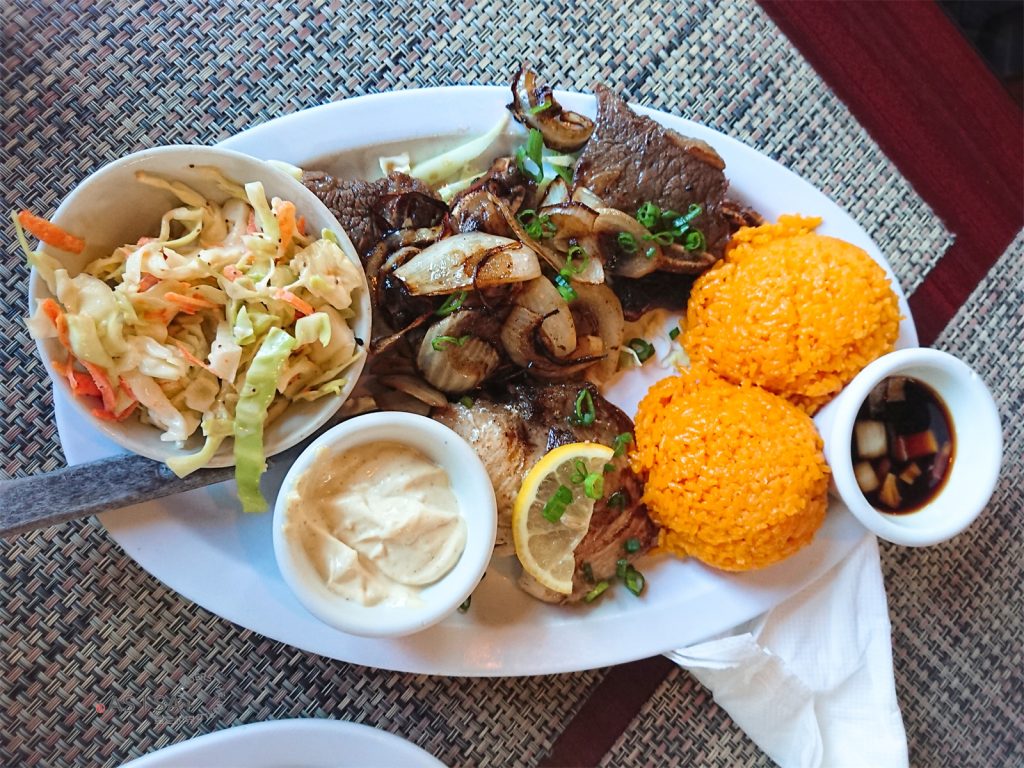 關島傳統料理烤肉(牛),搭配洋蔥、紅米飯與沙拉、芬拿鼎醬汁。先將肉料以醬料醃製12Hrs後小火慢烤20分鐘,鎖住肉汁。