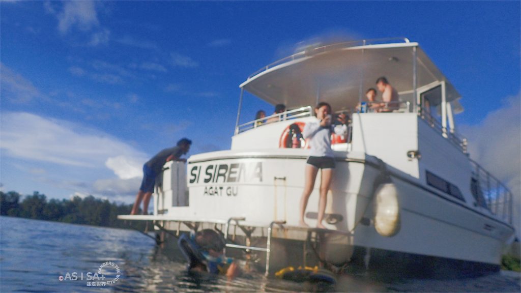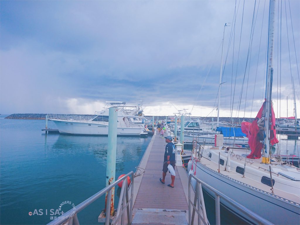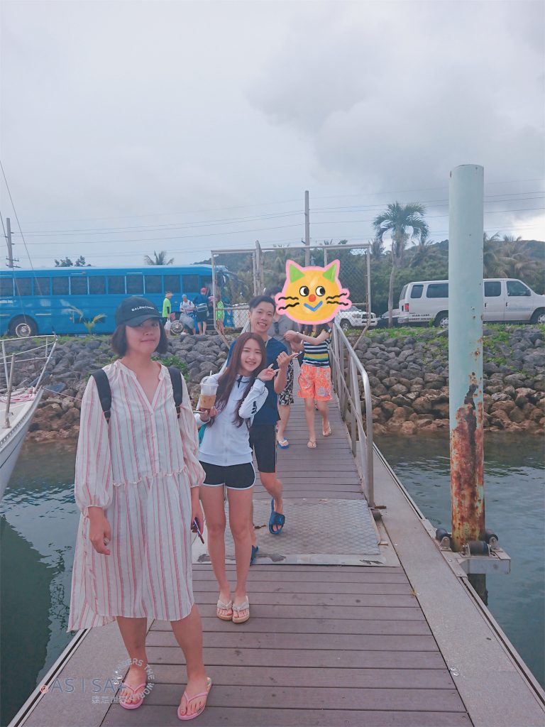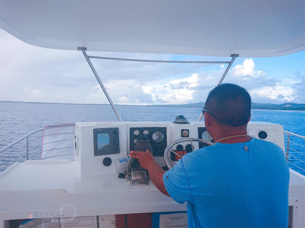 活動包含飯店接駁,從飯店到Agat Marina碼頭車程約半小時,抵達碼頭準備登船出發囉! 親切幽默船長很健談,聊天時船長說我的名字「Isa」在查莫洛語是「彩虹」的意思,繼菲律賓語「Isa=NO.1」,又學了一個意思。