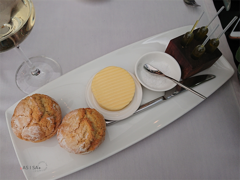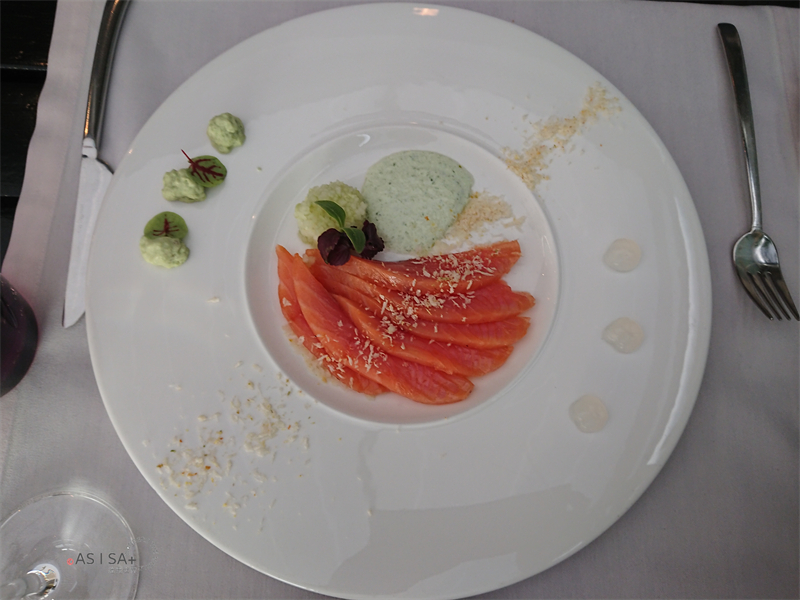 生鮭魚、酥脆檸檬碎粒、希臘酸酪醬汁、琴酒凝凍、芹菜與酸黃瓜奶油