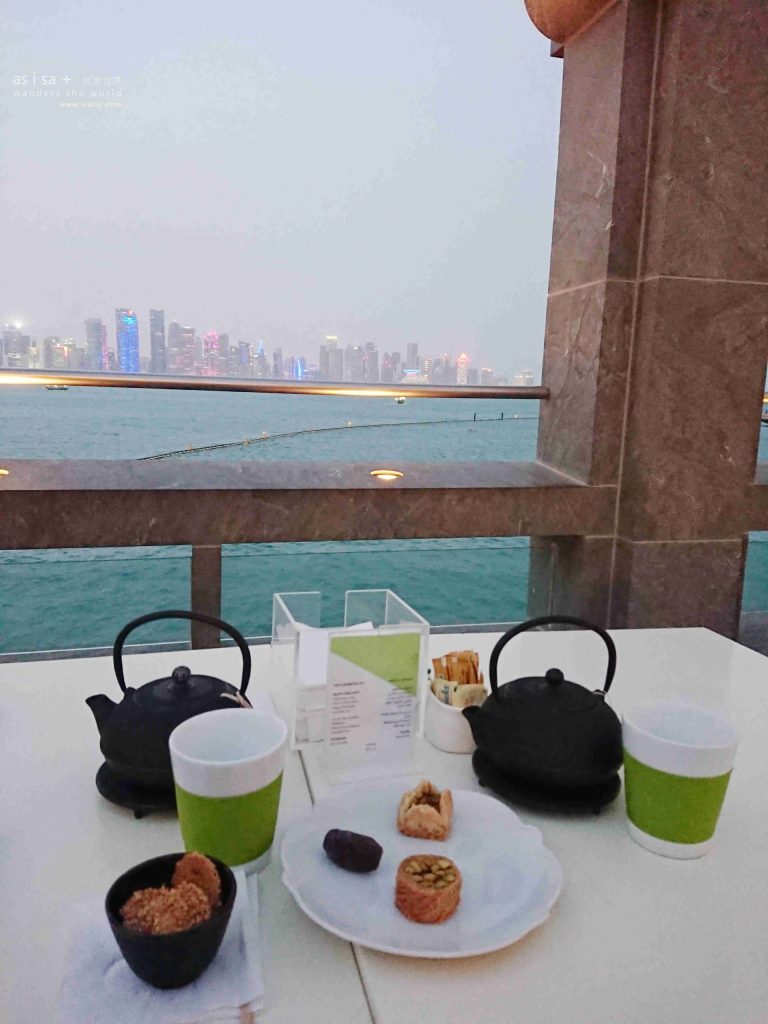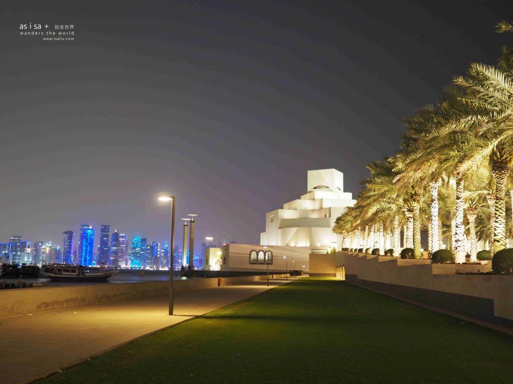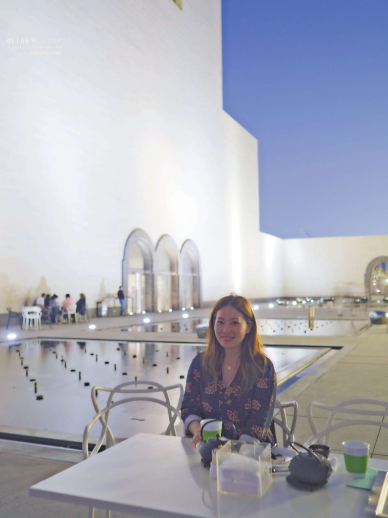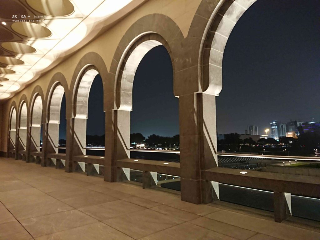 參觀結束後,別錯過博物館的 頂樓露臺。白牆、水池、傳統伊斯蘭拱門構成純淨的空間感。無論白天、黃昏或夜晚,都能透過拱形門框望見對岸的杜哈摩天大樓。在博物館咖啡廳點份飲料甜品,可以選擇送至頂樓露臺座位區,邊享用邊邊享受海風輕拂、夕陽染紅天空與波斯灣夜景。