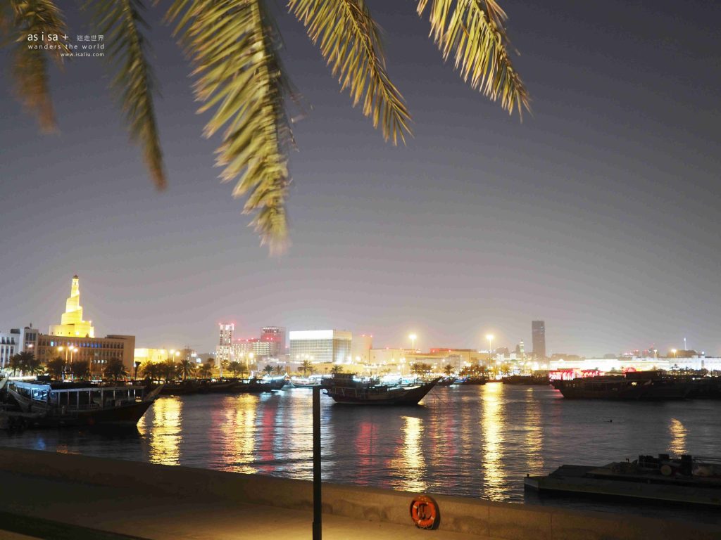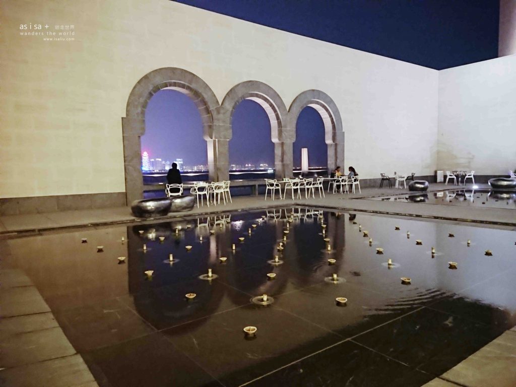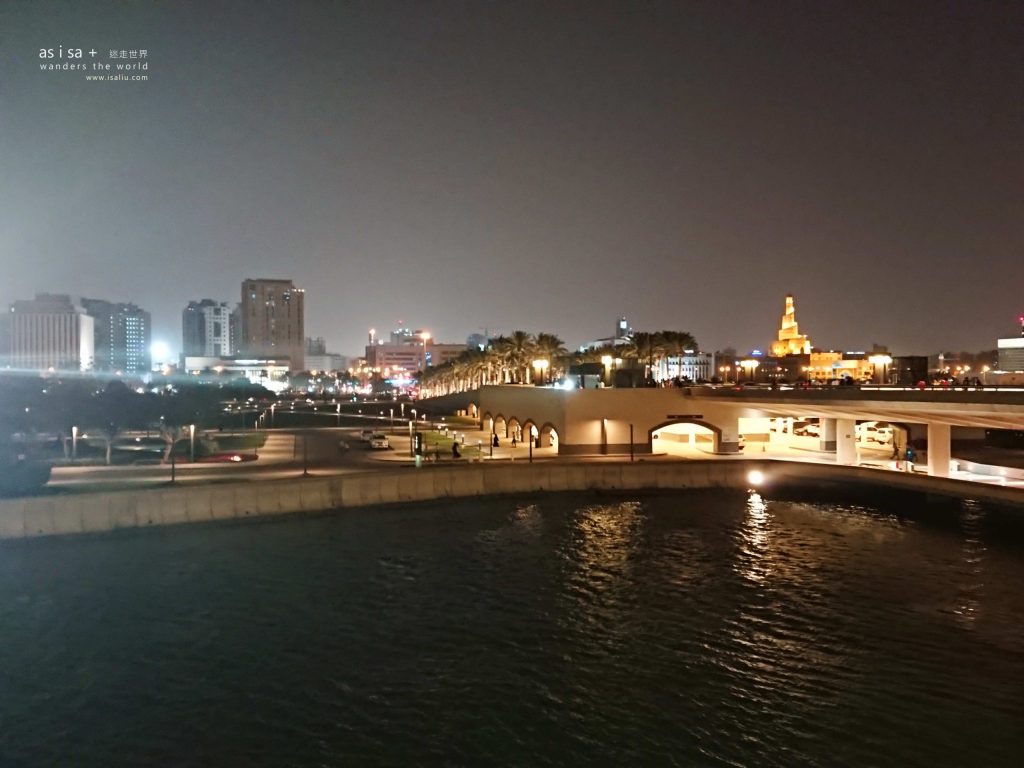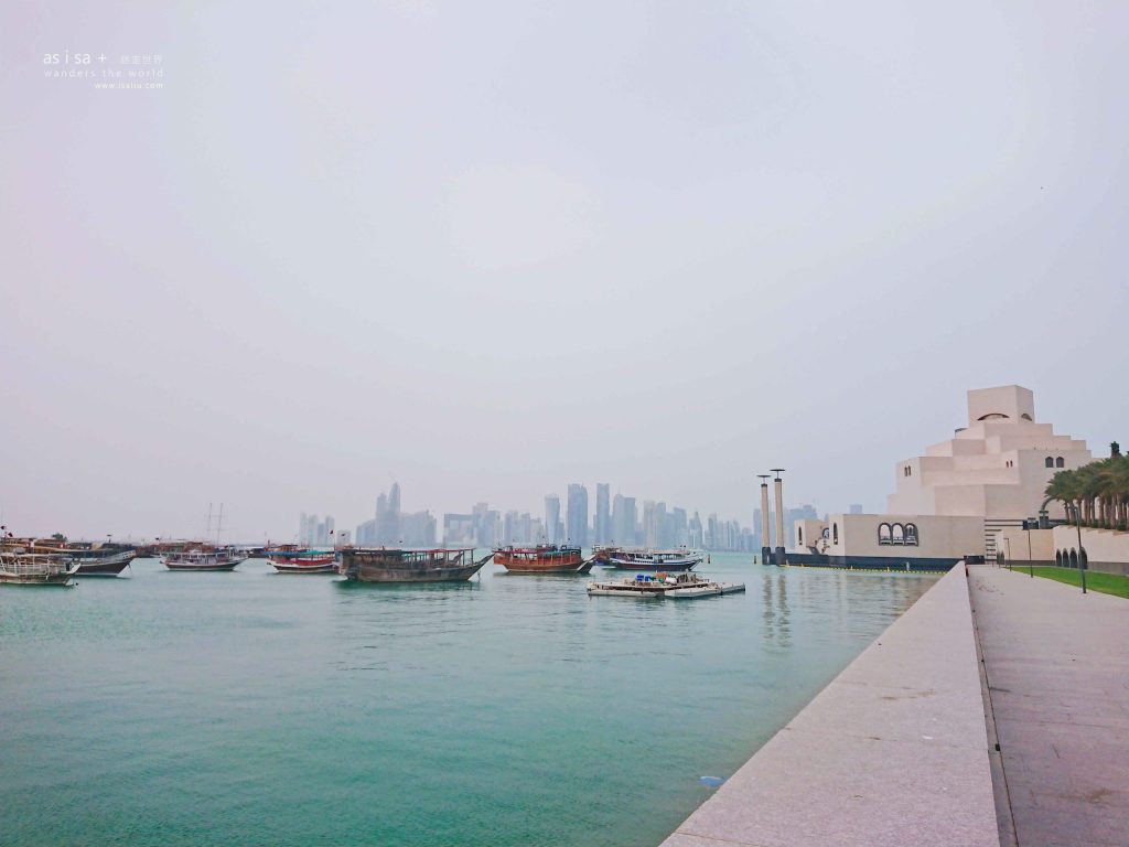 參觀結束後,別錯過博物館的 頂樓露臺。白牆、水池、傳統伊斯蘭拱門構成純淨的空間感。無論白天、黃昏或夜晚,都能透過拱形門框望見對岸的杜哈摩天大樓。在博物館咖啡廳點份飲料甜品,可以選擇送至頂樓露臺座位區,邊享用邊邊享受海風輕拂、夕陽染紅天空與波斯灣夜景。