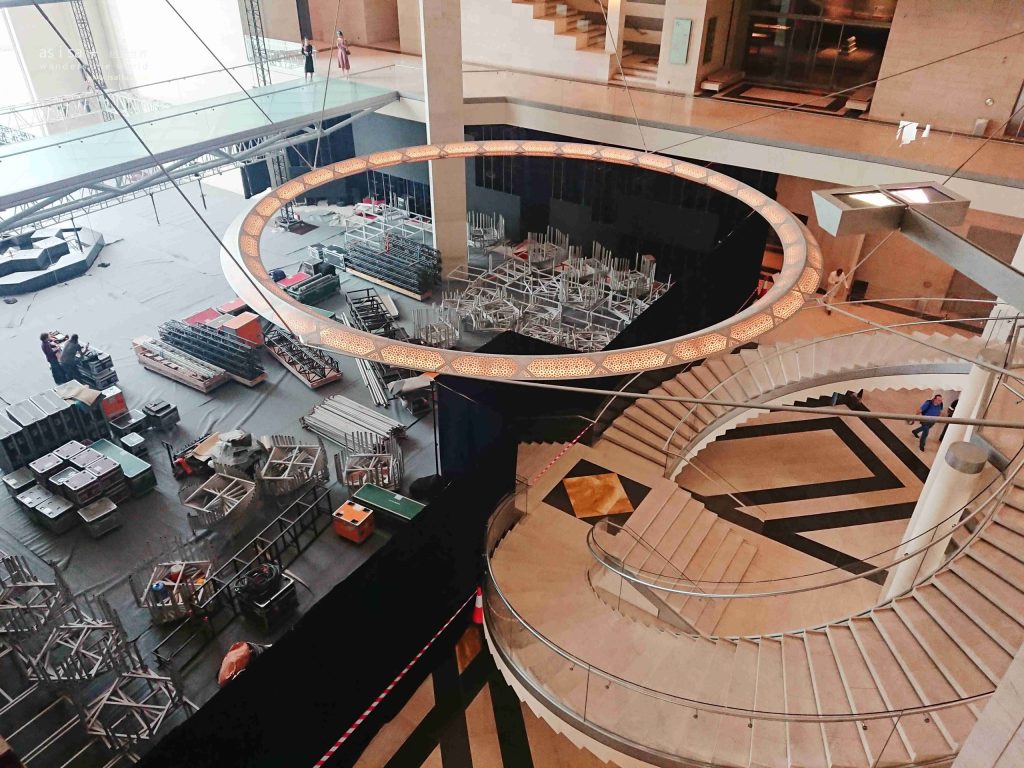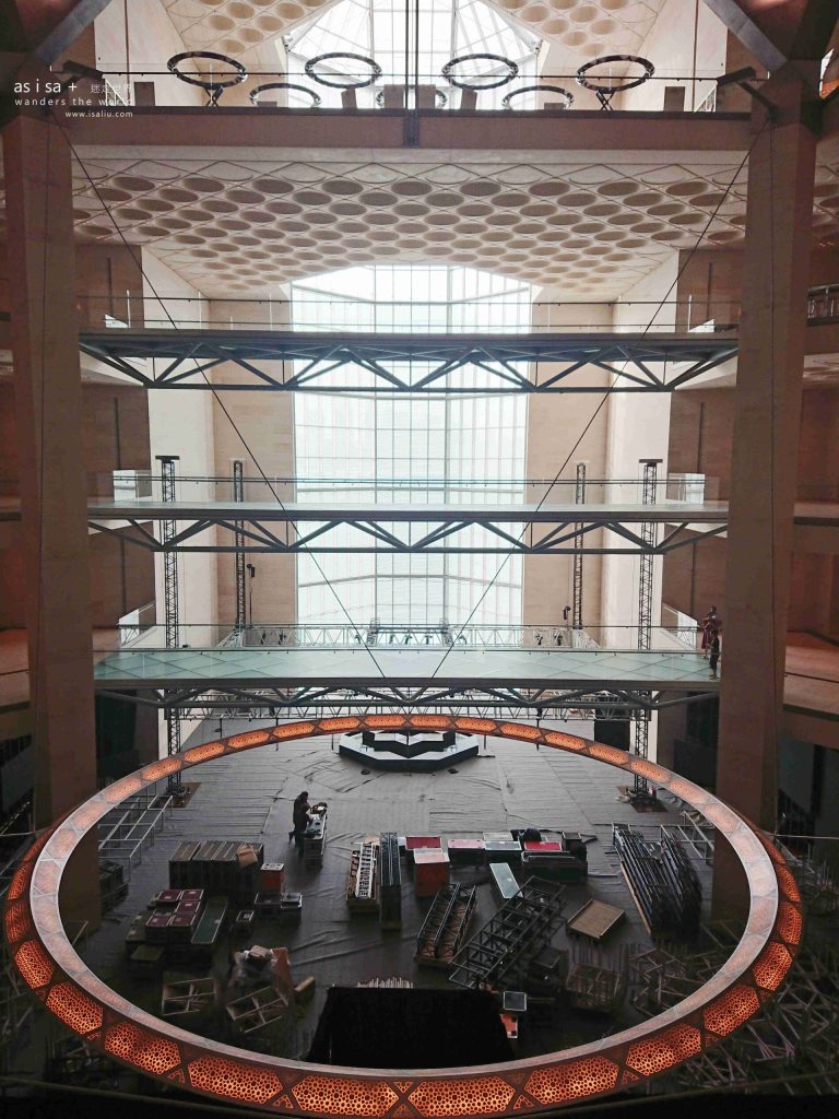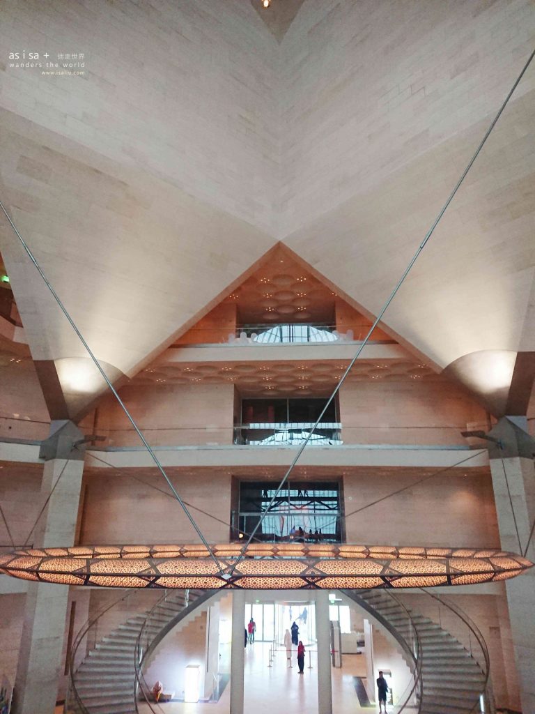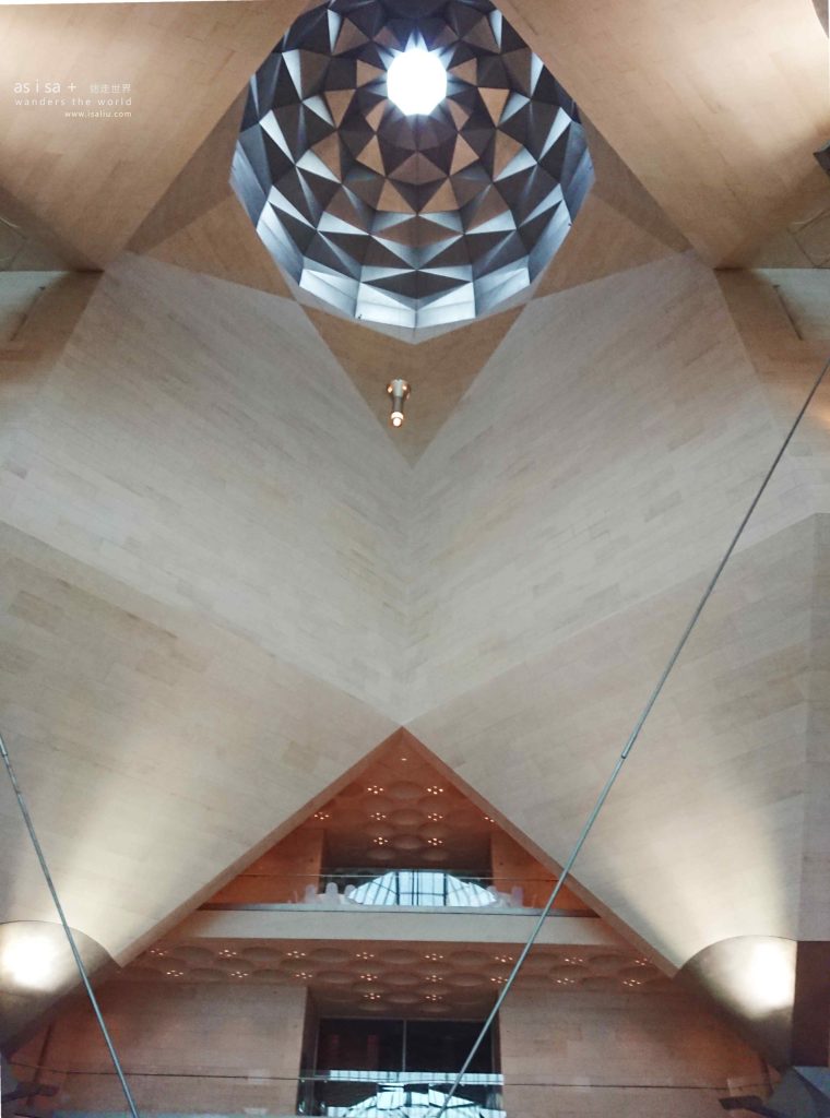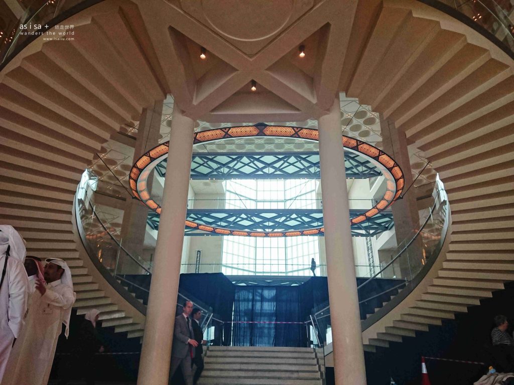 走進館內,大廳氣勢與外觀的簡樸截然不同。最吸睛的是一整面 從地面直通150英尺高穹頂的玻璃幕牆,透過它能隱約看見杜哈灣的摩天大樓群。挑高的銀色不鏽鋼圓頂設計巧妙,中央開口讓自然光灑落,與館內幾何線條交錯,形成光影如畫的效果。