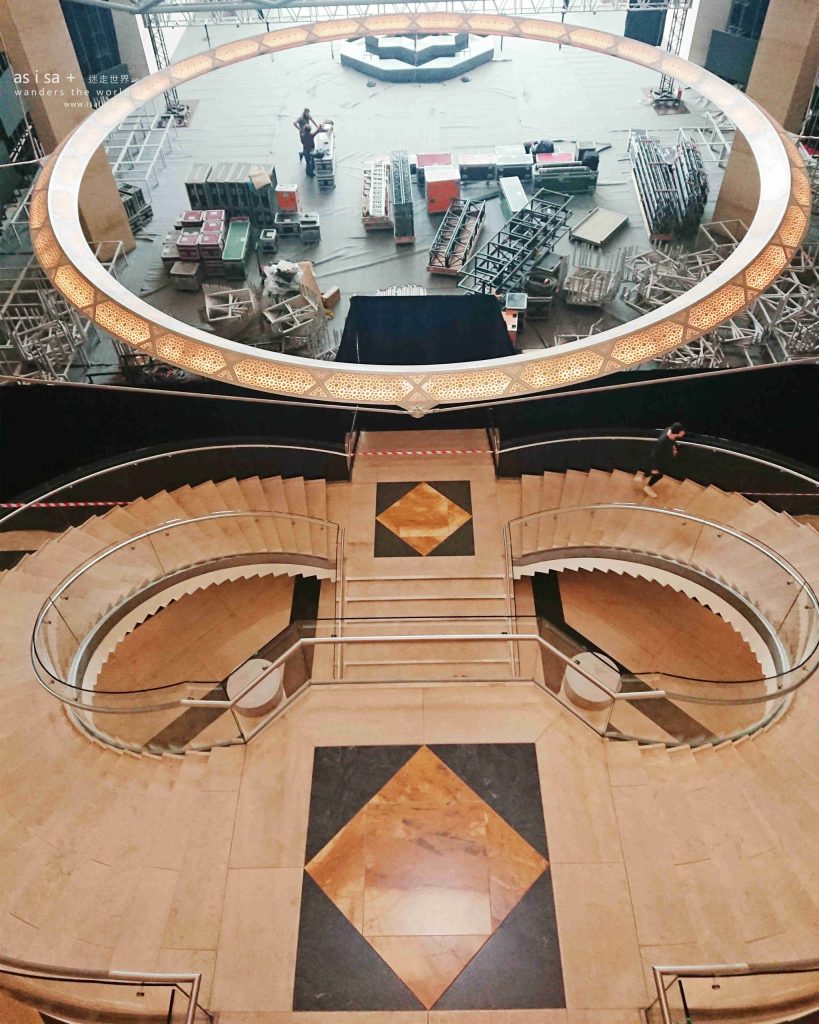 大廳左右兩側的雙分樓梯,從下往上望,正好與環形吊燈構成雙圓的視覺。拾級而上,可以更好欣賞內部細節: