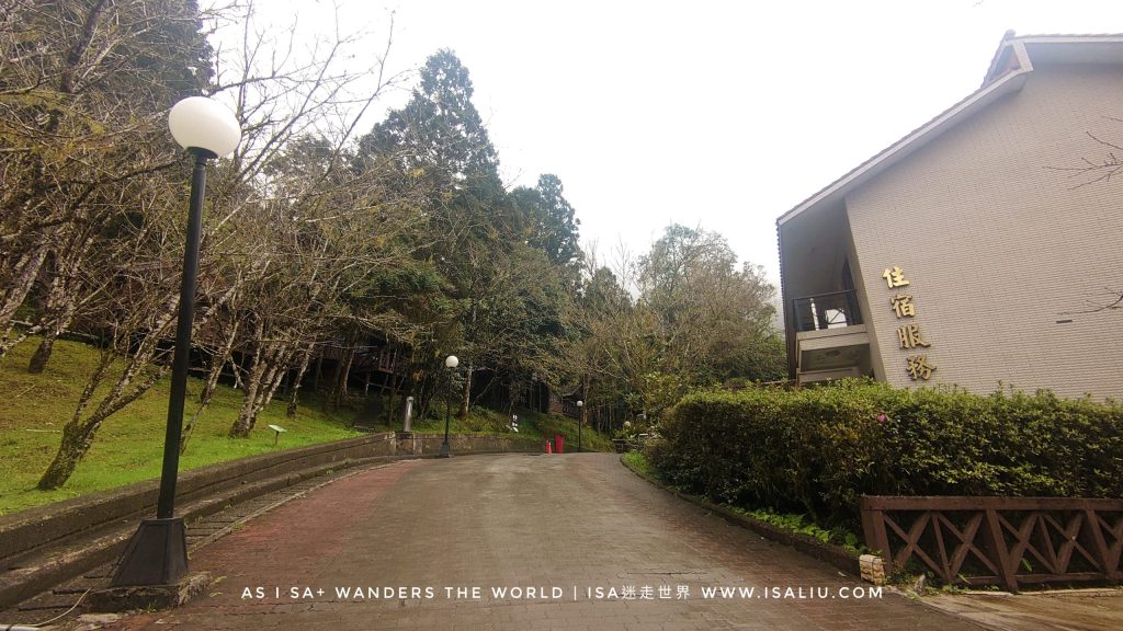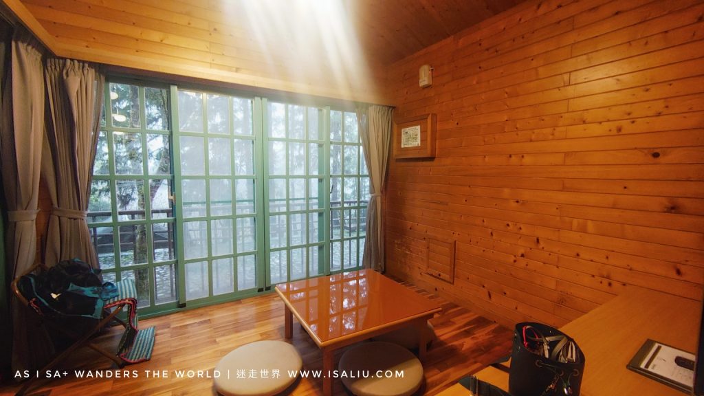 辦理入住在明池山莊一樓,山莊隔壁就是餐廳與小販部,房型有一般房型(山莊)與小木屋(林間木屋、青苔木屋、度假木屋、原野木屋),我們訂得是青苔木屋,位在小木屋區的第二層,剛好拿到位於景觀台旁的1201房,門口出來走兩段階梯就可以到山莊與餐廳。可以先開車到山莊辦理入住手續,再開車到小木屋門口下行李後,再將車開到入口的停車場,不用拉行李上上下下的方便多了。